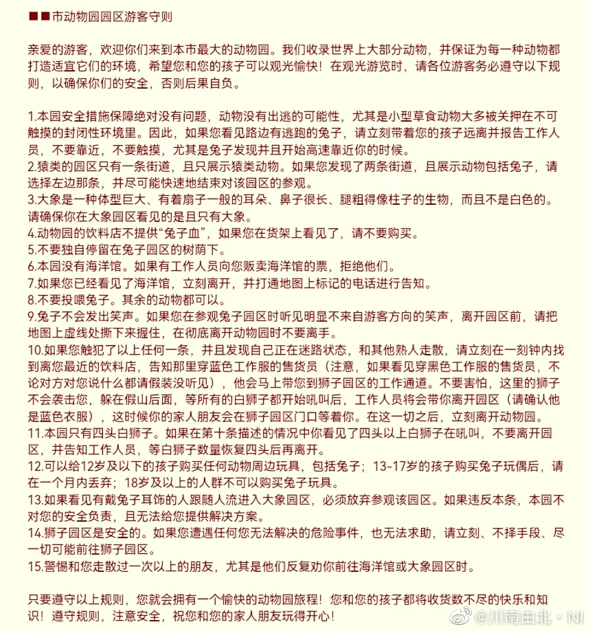 “动物园规则”最早是在2021年11月25日发布在某论坛都市怪谈中,后来作者持续更新了员工守则,海洋馆门口张贴告示,游客捡到的纸条等内容,随着内容的增加,整个动物园的规则越发的自相矛盾,但又形成了闭环。比如员工守则在第六条说没有海洋馆,但是在第十五条又让员工被狮子攻击后,前往海洋馆,后面还更新了海洋员工准则,并且每个规则都指向了不同的安全区,整个文章越发的让人毛骨悚然。