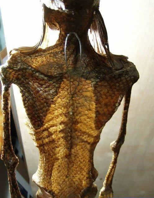 这是挂起来的美人鱼干尸,有着跟人类一样的肋骨,手臂骨骼也非常清楚