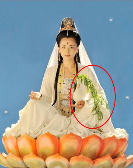 大家看下面刘涛扮演的观音的形象中,观音手持的瓶中插的正是柳树枝,观音身边的圣物,当然妖魔鬼怪都害怕了!