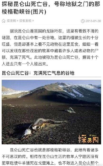 昆仑山死亡谷那棱格勒峡谷是不允许普通人进去的,想要旅游探险一番的朋友们可以打住了。更多的传说中是只要进去就是一个死,因为那里地理环境和磁场效应,会有雷电来劈地面上的移动的生物,凡是站立凸起的都会给两雷,劈散不可,所以几乎进入的人畜都会死亡。