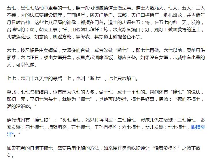 在这么多七当中,最重要的是头七和五七,过七七主要就是烧纸上坟即可,没有太多其他的讲究,需要注意的是查一下日子,看看有没有“犯七”,所谓的犯七就是过七的时候刚好跟初七、十七、二十七这些日子重合,犯七不同的地方处理方法不同,大部分地方都是推迟或者提前一天过七。需要注意的是:“七七”之内,孝子不理发、不修面,称为“囚七”。