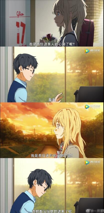 这句话出自日本动画《四月是你的谎言》,女主宫园薰给男主有马公生写信问:“我是否也住进了你的心理呢?”男主信中这样回复“连鞋都没脱就住进来了呢”这是一种将无形的感情具象化的描写方式,意思是我对你一见钟情,一刻都等不及的爱上了你。
