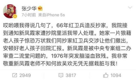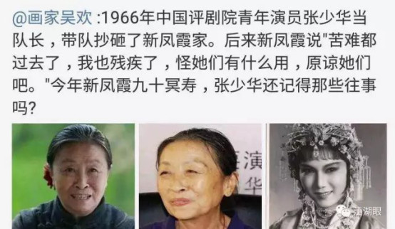 张少华在近期参加了一档节目叫《信中国》,在参加这档节目的时候,张少华坐着轮椅出现,现在正处于风口浪尖的她,受到了网友的质疑,都怀疑她是为了博同情。那她为什么会沦落到这个地步呢?原因是老艺术家新凤霞的儿子吴欢在微博上爆出,母亲在1966年的时候曾经遭遇抄家,当时就是张少华带人去抄的家,还将新凤霞打伤,导致她成为残疾人,之后再也没有机会登上舞台。张少华虽然在微博上反驳,但是还是引起网友的抵制。