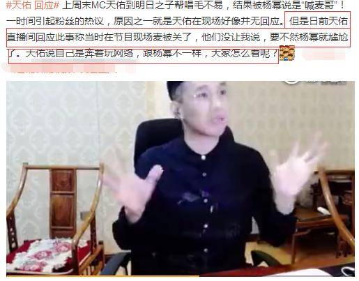 据说如果不是现场天佑的麦被关掉可能会引起不可收拾的场面,其实杨幂平时大大咧咧有什么说什么,直爽的性格,但是也不能这个说一个队音乐说唱热爱的人,说人家是“喊麦哥”是对他人的不尊重,藐视。