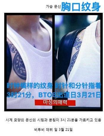 第三处是在右胸前一个时钟的样子:上面是一个时间3:21,这个是纪念他在BTOB出道的日子。