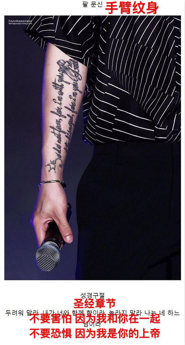 他身上的纹身是年轻时候的叛逆期纹的。他身上有三处纹身,一个在右手上一串英文字母:Fear thou not for I am with thee be not dismayed for I am thy God,是圣经上的经典话语“不要害怕,因为我和你在一起,不要恐惧,因为我是你的上帝”。