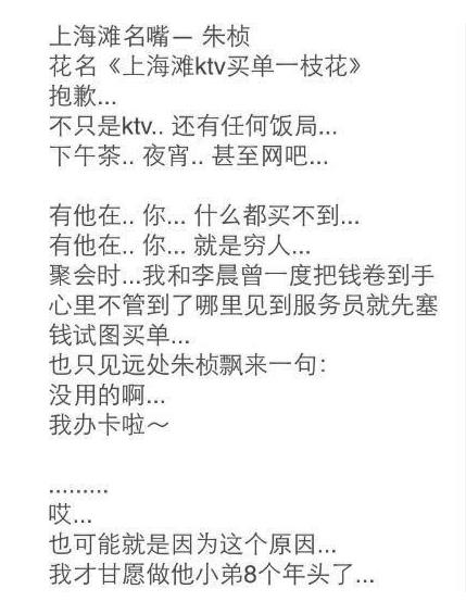 其实在不少综艺节目上,林更新、陈赫等朱桢的一众好友们都透漏过,朱桢是上海买单请客的一枝花,他对朋友真可以用肝胆相照来形容,只要是跟自己合得来的朋友,都会拿出一众舍命陪君子的行动。朱桢在跟朋友们一起吃饭、唱K、玩等等的花销都会抢着买单,大家可以想一下,这样对朋友非常真心的人,又抢着买单的人人员能差了吗??