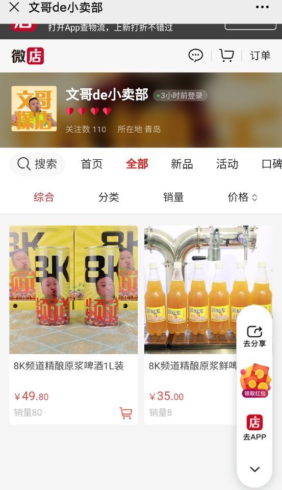文哥还在公众号的小店里卖啤酒,目前销量较低,相信后期文哥的名气更大了,粉丝多了,还会出更多新的产品。