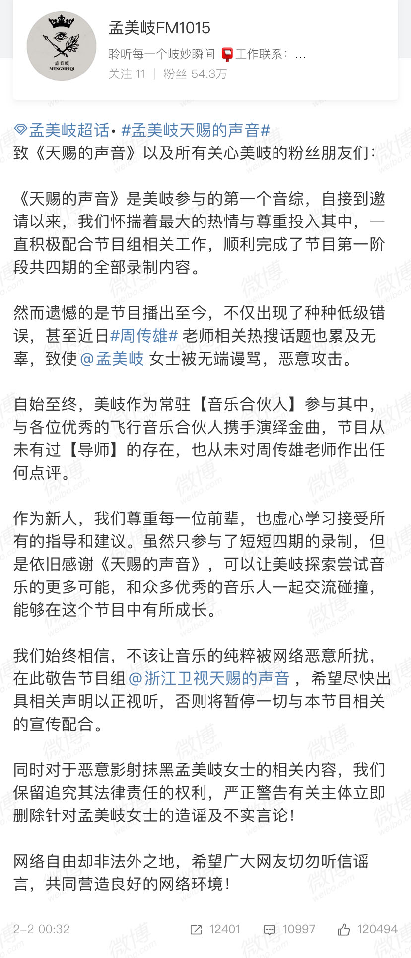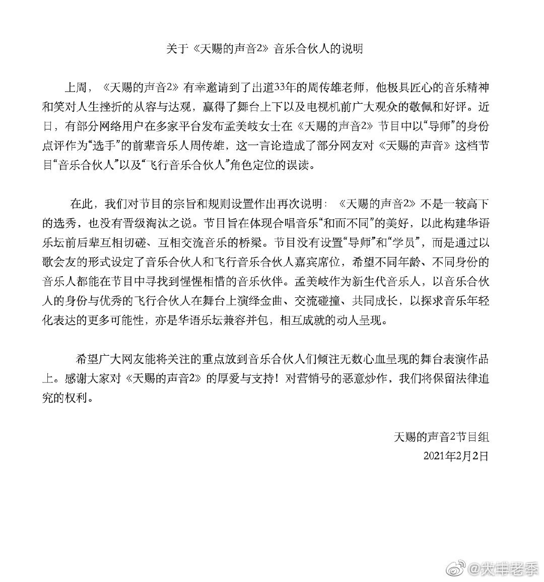 孟美岐是新生代选秀出身的艺人,这两年很火,也有大量的粉丝,不过最近在《天赐的声音2》上,因为传言她点评音乐前辈周传雄,还给在节目上做导师引来很多网友的“不适”,一个是已经出道33年已经51岁的老前辈,一个是刚刚崭露头角,确实有流量的新生代艺人,这样“角色错乱”的定位确实令很多网友愤怒,表示孟美岐是“凭什么”当导师?对此,《天赐的声音》节目组也及时给出声明了,说孟美岐从没点评过周传雄,自己本身也不是导师,而是“音乐合伙人”,下面是对于此事件节目组给出的回应: