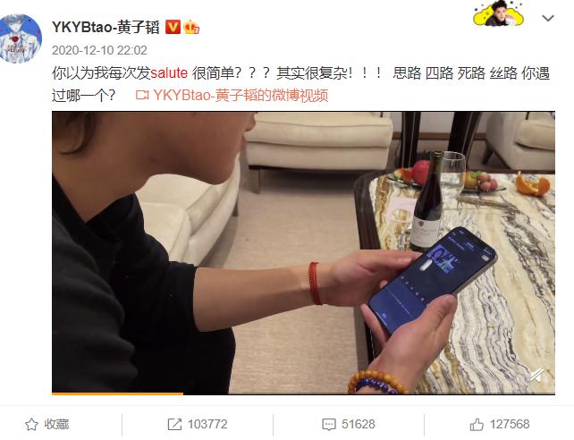 看起来黄子韬是非常喜欢上网玩并且十分喜欢这个梗,经常就用起来了,在自己微博里面各种玩闹着要转账,并在结尾添上了Salute。甚至在直播的时候,也因为劝说粉丝面对出轨要直接分手,而穿插这Salute的话语,一时间Salute这个梗,因为黄子韬又登上了一个新高度,持续保持着常用梗热度。