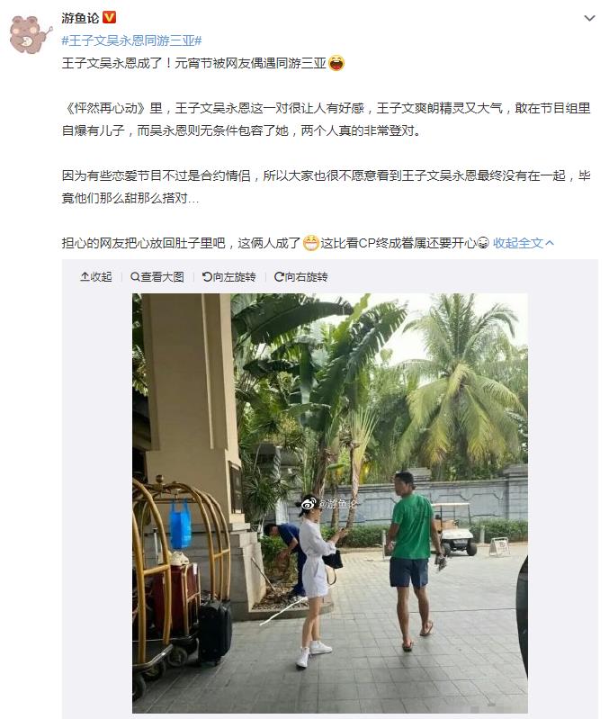 目前从两个人相处的节奏上来看,如果节目不是按照剧本走的,如果是真爱,不是吴永恩想借着王子文上位的话,两个人在一起的可能性很大,他们还被偶遇一起在三亚旅游,相处的十分甜蜜!