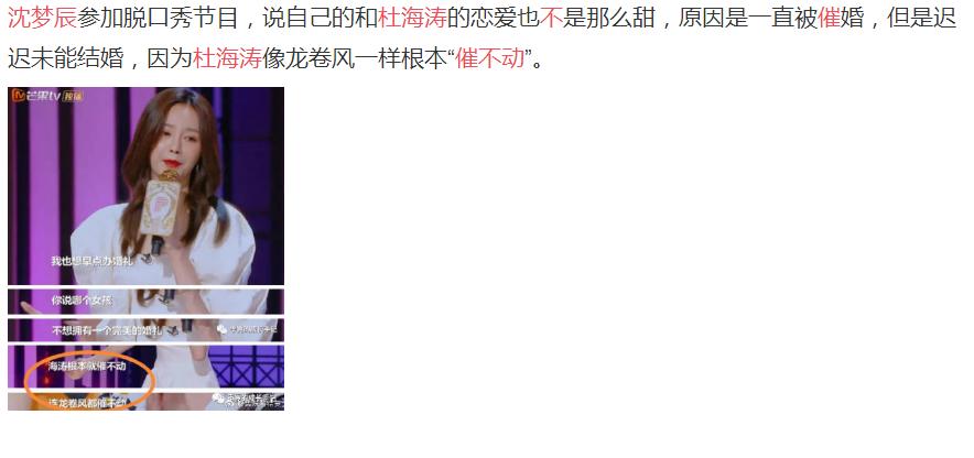 在《听姐说》第三期中,沈梦辰谈到身边的亲戚朋友都在催婚,因为大家都知道她和杜海涛在一起很久了,但两人迟迟不结婚,让很多人都加入了催婚大军中,不过沈梦辰说自己催不动杜海涛,所以一直不结婚的原因只有一个,就是杜海涛不想结,而沈梦辰也说过两人中间也分手过,还是沈梦辰求复合的,只能说在这场感情里,沈梦辰完全没有主动权,所以他们的结局如何,现在还很难说。