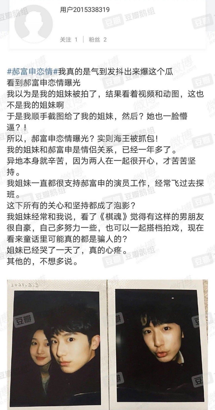 大家都知道,最近郝富申恋情曝光,让“郝胡CP”be了,但是随之而来的还有一个更大的料,那就是郝富申亲吻的女主吴茜,并非郝富申的正牌女友,疑似脚踏两只船,郝富申的正牌女友被网友爆料叫张云琪。事情的经过是这样的,在郝富申亲吻照片曝光后,张云琪的闺蜜发现郝富申亲的人不是张云琪,然后就发了下面这一段文字: