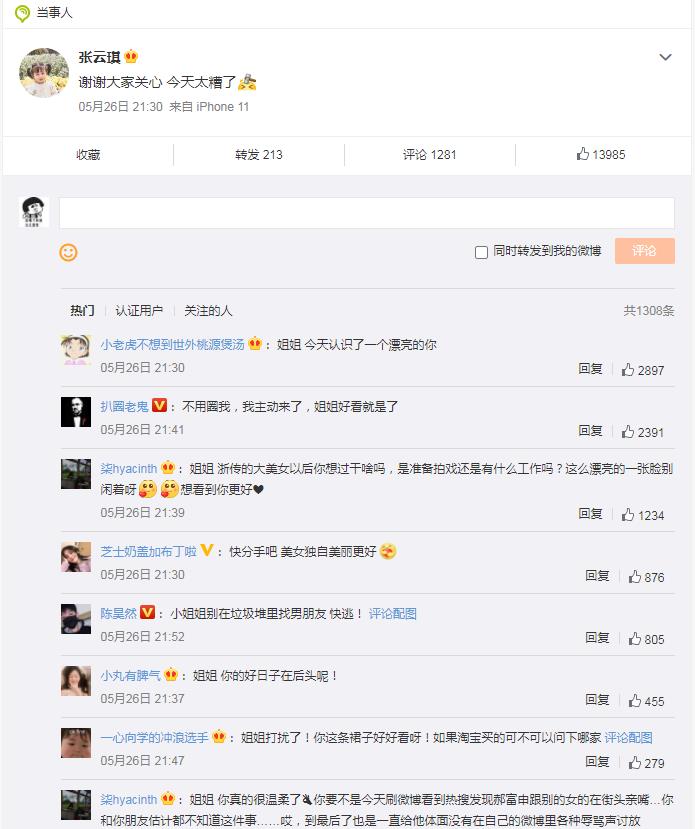 对于被劈腿,张云琪很快在微博上说:“谢谢大家关心 今天太糟了”。
