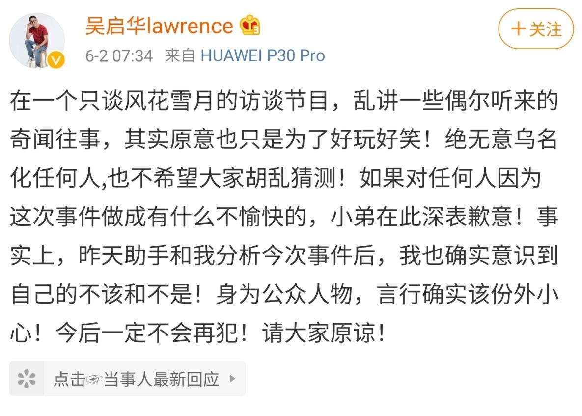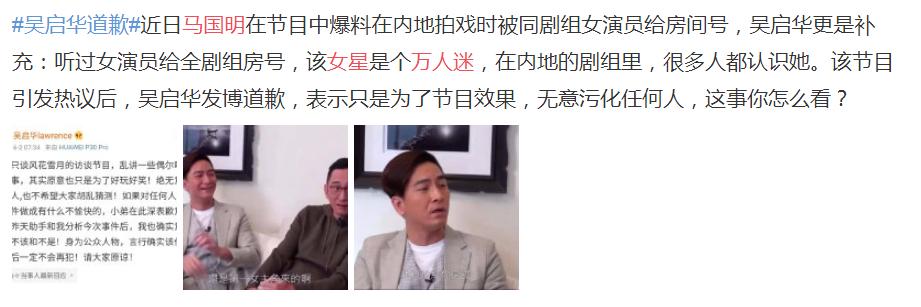 不过后来吴启华公开道歉,说只是为了节目效果,都是听来的,不过还是有网友半信半疑,有人认为马国明和吴启华说的并不是一个人,不过因为吴启华道歉,所以这件事也就到此为止了,所以到底是谁直到现在也没有个定论。
