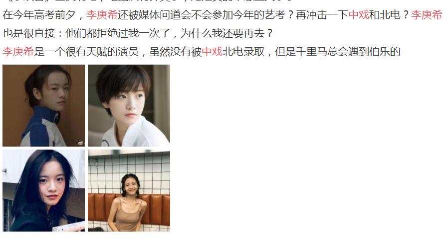 2019年李庚希艺考时同时报考了北京电影学院和中央戏剧学院,但没想到她专业课竟然没过关,最后被两家院校刷了下来,李庚希知道结果后,当年连高考都没有参加,次年有采访问她要不要继续考北电和中戏,不过李庚希表示了拒绝了,说已经被拒绝一次了,不想再报考了,因此这几年李庚希都没有参加艺考,连高考也没有参加,看样子是不打算继续学业了。