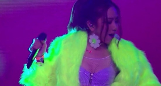 邓紫棋演唱歌曲,以内衣外穿造型出场遭到网友不断吐槽,身穿蕾丝吊带内衣的邓紫棋,大秀性感丰满胸围。