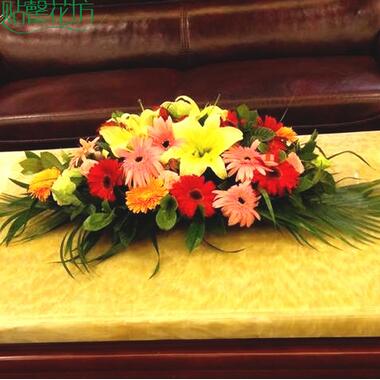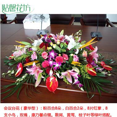会议台花(豪华型):粉百合8朵,白百合2朵,8片红掌,8支小鸟,玫瑰,康乃馨点缀。散尾、黄莺、枝子叶等绿叶搭配。
