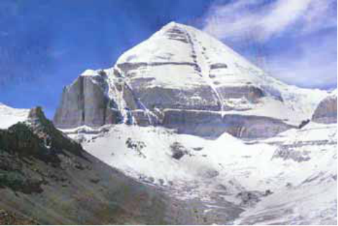 由南面望去可见到冈仁波齐峰著名的标志:由峰顶垂直而下的巨大冰槽与横向岩层构成的佛教“卐”字符号,是佛教中精神力量的标志,意为佛法永存,代表着吉祥与护佑。相传,苯、佛相争的早期,佛教尊者米拉日巴与苯教徒纳若本琼于冈仁波齐峰斗法时存留下来的遗迹。