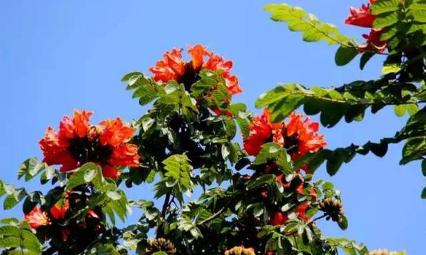 形态特征:树干通直,灰白色,易分枝;叶为奇数羽状复叶,全缘,小叶具短柄,卵状皮针形或长椭圆形;圆锥或总状花序,顶生,花冠钟形,红色或橙红色。