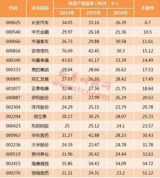 净资产收益率方面,169只个股中17股2014年~2016年连续3年净资产收益率均超过20%。其中长安汽车最新市盈率不足10倍。