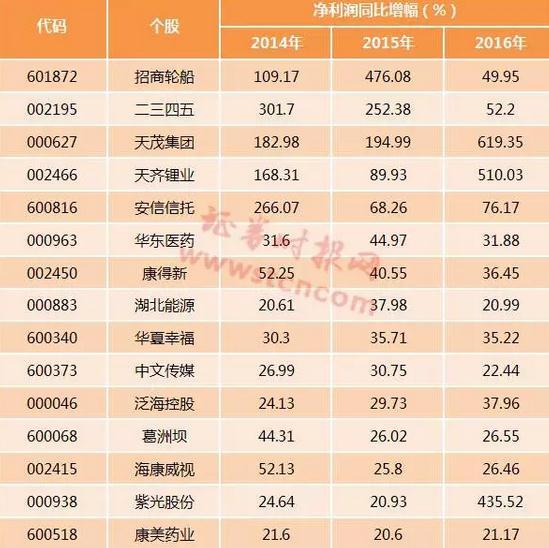 从个股成长性来看,上述个股中15股连续3年归属母公司股东的净利润同比增幅均超过20%。
