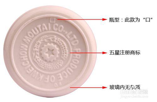 酒瓶方面:贵州茅台酒酒瓶底部有公司注册商标(五星牌),在烧制工艺上,瓶身均匀,玻璃内无杂质,瓶身表面无金属粉状材料,瓶底有瓶子厂的代码,目前公司茅台酒瓶型有四种,即HB、MB、CKK、口。(通常一箱茅台酒里上述瓶型最多只能有两种)。