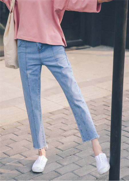 直筒裤子或九分裤都会让腿部显得很粗,尤其是带有翻遍设计的裤子更会让腿部难看。如果对自己的腿部没有太多的信心,只能才有掩饰法了。穿搭宽松的哈伦牛仔裤,搭配高跟鞋,会让整个腿部看起来很长又显细。