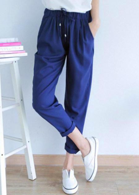 一些女孩腿部弯曲的地方在臀部以下膝盖以上的部位,这类女生普遍表现为髋骨太宽以至于两个大腿之间的缝隙太大。裤子的长度一定要合适,髋部的设计一宽松为主,小腿部位可以适当地露出来。黑颜色的收腰雪纺裤可以有效的修饰上腿部弯曲的不足。