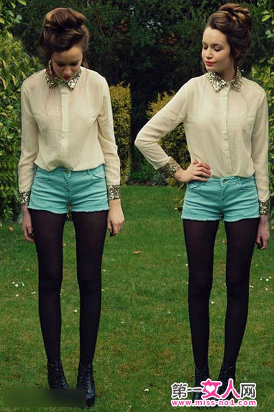 短裤最常见的搭配就是丝袜,即使秋冬怕冷,选择个厚一点的黑丝袜绝对能满足温度和风度的双重需求,在铺满黄叶的秋日,别提有多美。