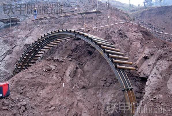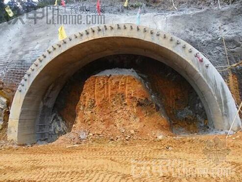 像上图所示,先根据设计好的位置,立好洞门拱架,然后浇筑混凝土。然后打入大管棚,就是上面那一排钢管,长度 10-30 米视情况而定,打入之后再高压往里面注入水泥浆,它的好处就是土跟钢管水泥浆粘结在一起,形成一个拱圈状的加固土体。这样挖的时候就不会容易垮了。做好之后大概就是这个样子了: