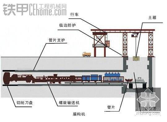 盾构机掘进的时候,前面是刀盘切削土体,后面是千斤顶加压使它前进。切削出来的土通过机械运出洞外,大概是这个样子的:
