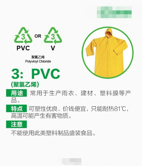 常见雨衣、建材、塑料膜、塑料盒等。可塑性优良,价钱便宜,故使用很普遍,只能耐热81℃.高温时容易有不好的物质产生,很少被用于食品包装。难清洗易残留,不要循环使用。若装饮品不要购买。