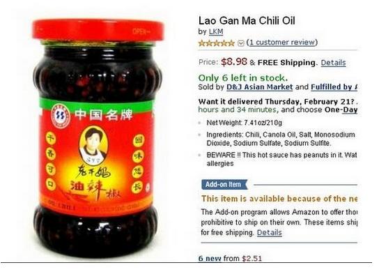 老干妈在国内只是一瓶普普通通的调味料,几块钱就能买到了。而很多国外的人要花很多钱才能买到,比如一瓶280克的辣酱在国内7.9就能买到,而在美国要花3.9美元,也就是人民币24块。而在亚马逊上的一次活动也要卖到11.92美元两瓶,就是说一瓶要37元人民币。其实老干妈只是在亚马逊上卖的贵一些,而在美国的超市也只有2-3美元。
