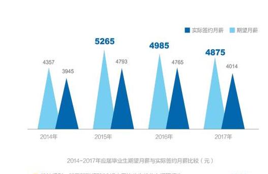 智联招聘发布的一个毕业生薪酬统计,从图表中可以看出今年的毕业生薪酬相比去年是下降的,并且毕业生拿到的实际起薪也远不如期望的那么高,只有4000元左右
