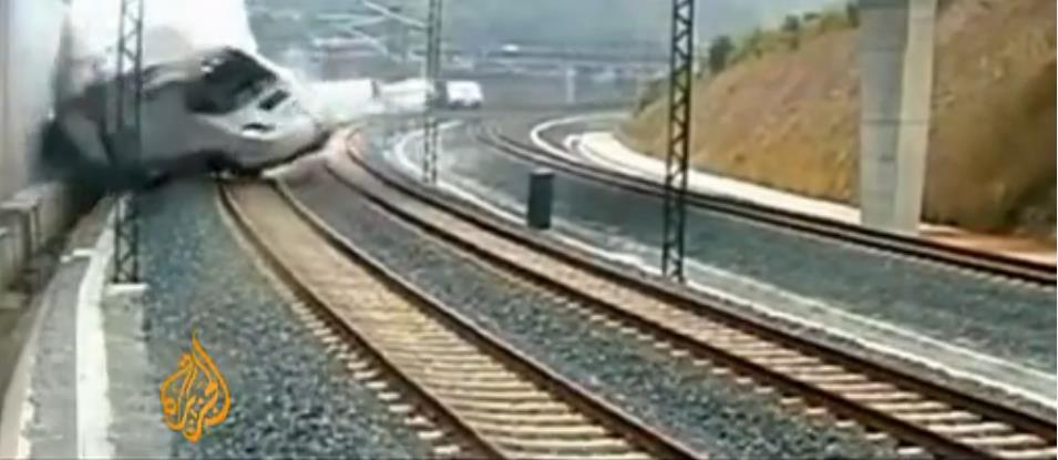 这是一辆西班牙列车脱轨事件,很可能是因为转变的时候速度太快,也就是说超速行驶是火车脱轨的主要原因。