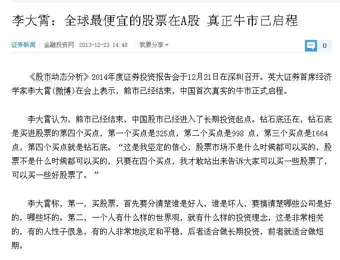 这个论断其实是李大霄在2013年发出的判断,让我们看看当时李大霄是怎么说的: