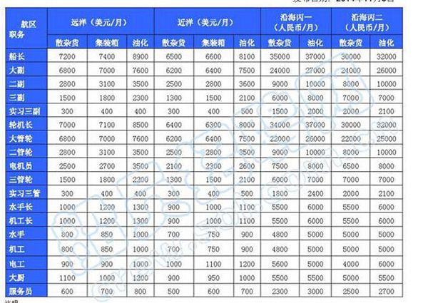 远洋轮船的船长的工资一般在两万左右,下面是各个职位的工资表: