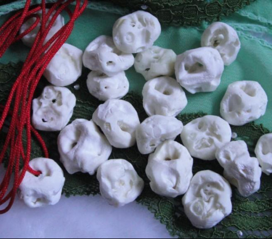 有时候出去玩的时候,看到一些小盆友的手腕上都系着一根红绳,红绳上面有像骨头一样的东西,就好奇问,原来这是猪惊骨。猪惊骨取自猪耳朵里面的一块名为惊骨的骨头。这骨头长的奇特啊,从正面看就像一个骷髅头,但是从反面看呢就像一个龙头,或许正是因为他的形状,老祖宗才拿来 给孩子们辟邪,压惊用的。