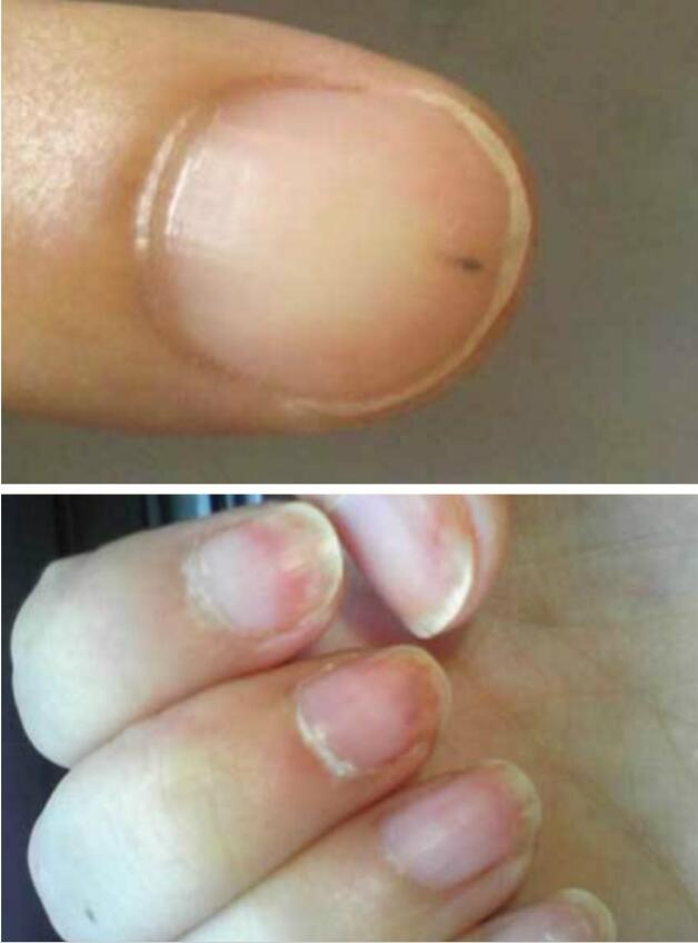 指甲上如果出现上面这种黑斑或者是白斑的情况,说明指甲很可能出现了真菌感染,比如说脚癣、牛皮癣等真菌的感染;如果是儿童指甲上出现了白斑,有可能是身体缺乏微量元素锌或者是肚子里有蛔虫。总之出现这些情况后,不同的人群要区别对待。