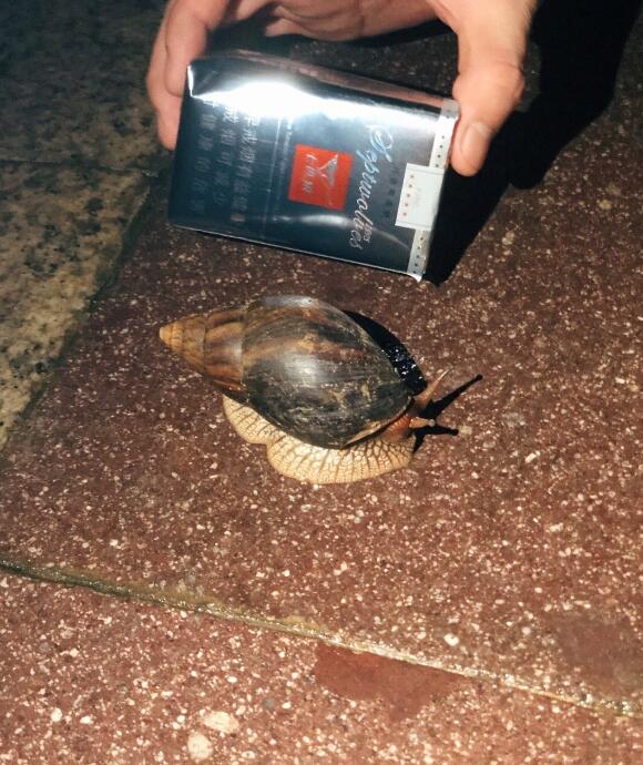 非洲大蜗牛的体型很大,一般都十厘米左右,生活条件好点的能长到二十厘米,这就有点可怕了,其实非洲大蜗牛听名字就知道不是咱们本地蜗牛,它是一个外来入侵物种,已经被列入了《中国外来入侵物种名单》了,可以说我国是很不待见它的。