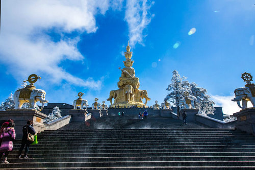 峨眉山还有一个称号,叫做“震旦第一山”,这其中有一个典故,古印度把中国称为“震旦”,意思是太阳升起的地方,而公元四世纪时,印度僧人宝掌和尚去峨眉山朝拜普贤菩萨,发出感叹:“高出五岳,秀甲九洲,震旦第一山也”,意思就是峨眉山是中国的第一山。此后这个称号逐渐流传下来,成为名扬海内外的旅游胜地。