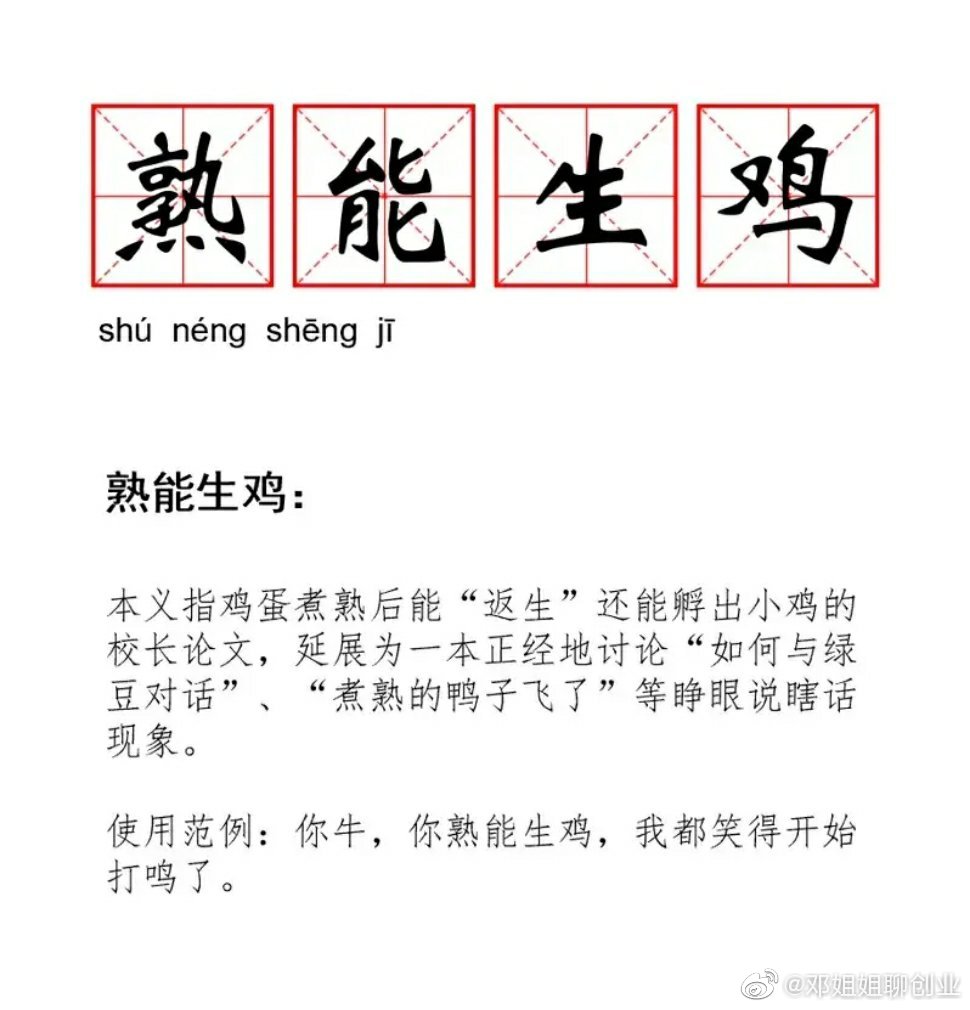而网友将这篇论文总结了一个新的成语“熟能生鸡”。最近新词真不少,前有潘嘎之交,今有熟能生鸡,都是用来讽刺某个现象的。