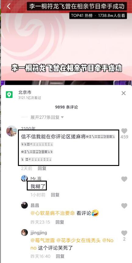 案例二,符龙飞和李一桐早年参加一个相亲节目,牵手成功,有网友评论:“信不信我能在你评论区搓麻将+牌面”,然后网友跟上“糊了”,这个糊了就是形容一个明星翻车。