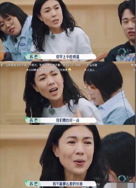 日前,苏芒参加综艺节目《五十公里桃花坞》,建议大家每个人每一天先交伙食费,宋丹丹提议说一人650,苏芒表示650真的不够,理由是你早上不喝牛奶啊,不吃鸡蛋啊?我们要吃好一点,我不能那么差的伙食。