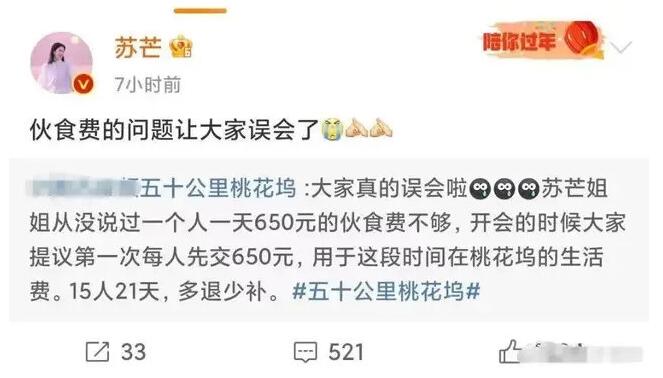 事件发酵后,苏芒和《五十公里桃花坞》发文称伙食费的事存在误会,650是21天的生活费,不是一人一天的。